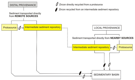 Sediment may be derived from different sources located either close to or far from the sedimentary basin (Figure 1), and its detrital zircon content depends on the dispersal path of the sediment from the inferred provenance area to the sedimentary basin [7,10,11,12].