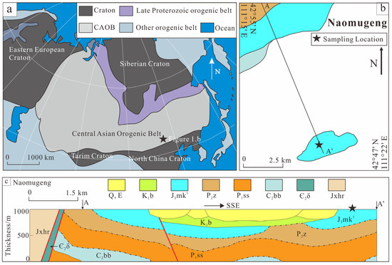 Modified geological maps of the study area with sample locations. (a) The sketched geomap showing tectonic units adjacent to CAOB [19]. (b) The simplified geological map of Naomugeng in Siziwangqi with the sample location (after 1:250,000 geological maps of Bulitai areas). (c) The geological section of the Naomugeng area. Q, E: Quaternary and Palaeogene; K1b: Baiyinhua Formation; J3mk1: lower section of Manketoúebo Formation; P2z: Zhesi Formation; P1ss: Shoushangou Formation; C2bb: Benbatu Formation; Є2δ: diorite of Middle Cambrian; Jxhr: Halhada Formation.