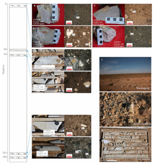 The Naomugeng lithium deposit is a clay-type lithium deposit that developed in a caldera setting. The felsic volcanic rocks from the Manketou’ebo Formation were identified as an ore-host rock. The lithium was carried by the hydrothermal and enriched in the crystal tuff. The extreme lithium enrichment may be from the leaching of volcanic materials or from post-magmatic fluids. The core and the earth surface samples have high lithium contents of 1421–3014 ppm.