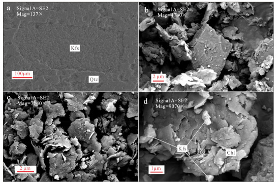 SEM images. (a) Altered K-feldspar fragment and protruding hard quartz are found from the altered rocks. (b−d) The flake clay minerals and granular feldspar can be detected from the powder samples. Note: Qtz—quartz; Kfs—K-feldspar; and Chl—chlorite.