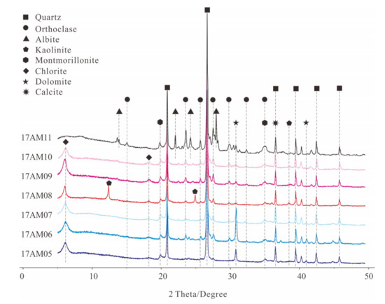 XRD results identified the phases of quartz, orthoclase, albite, kaolinite, montmorillonite, chlorite, dolomite, and calcite from the samples.