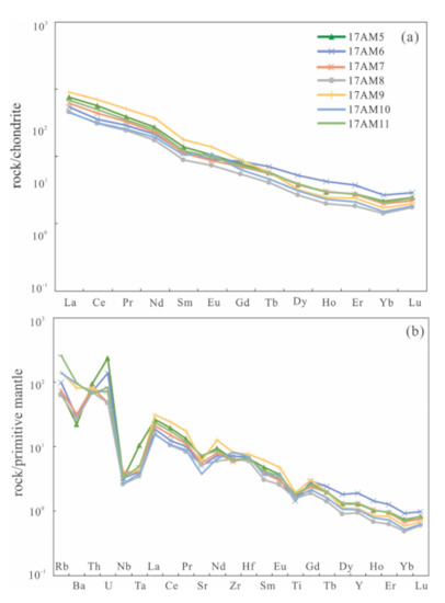 (a) Chondrite-normalized REE patterns and (b) primitive mantle normalized trace element patterns in the ore-bearing tuff (normalized by Sun and McDonough [34]).