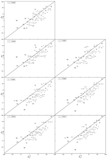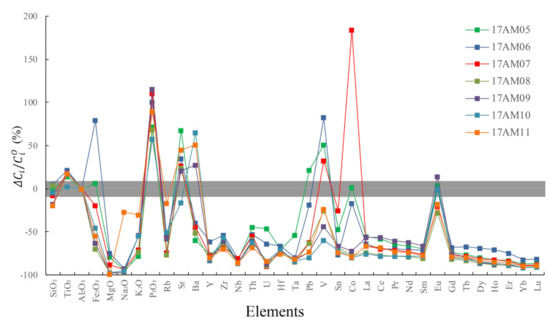 The mass changes from the hydrothermal alteration were estimated from the geochemistry data using sparse isocon analysis and the standardized method of mass change calculation. In this study, we used the average geochemical composition of the igneous rocks of Manketou’ebo Formation from adjacent areas as the “original rock” composition [15,17,18], and every dataset of the altered sample was used to calculate the reference frame and their amounts, and the ratios of mass transfer. We used the sparse isocon method to calculate the reference frame . The calculated values of and relative movement of elements from least alteration are shown in Figure 6 and Table 3.