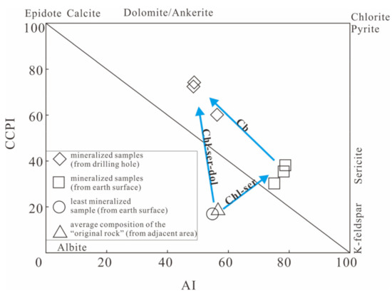 The element mass changes show evidence of metasomatism between the hydrothermal fluid and volcanic rocks. The LOI of the samples indicates high volatile contents and strong alteration. The LOI values of the earth surface samples are 2.96–4.75 wt.%, while those of the core samples are more than 5 wt.%, which may indicate that there are different contents of volatiles added to the rocks. From the petrography and XRD diffraction data, the volcanic rocks underwent chloritization, montmorillonization, and carbonatization (including calcitization and dolomitization). However, carbonatization is much more intensive in the deep part of the orebody. The spatial distribution of carbonatization is not consistent with that of chloritization and montmorillonitization, indicating that different parts of the orebody underwent different metasomatic processes. The carbonate–chlorite–pyrite index (CCPI) represents the degree of intensity of chlorite, sericite and pyrite alteration. The alteration index (AI) represents the degree of metasomatism that converted plagioclase to sericite, illite, and chlorite by hydrothermal alteration. An AI-CCPI diagram can be used to represent the alteration degree of the volcanic rocks [26]. The mineralized samples show chloritization and montmorillonitization. Moreover, the core samples also show carbonatization. These indicate that there are two alteration zones in the deposit (Figure 8 and Table 4).