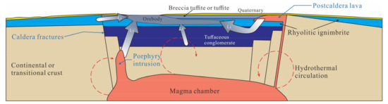The Manketou’ebo Formation volcanic rock is a set of felsic volcanic lavas and pyroclastic rock formed during the Late Jurassic [15,17,18,47,48]. The volcanic stratum of the Manketou’ebo Formation can be divided into three lithologic members, which are (1) tuffaceous conglomerate with tuffite; (2) rhyolitic ignimbrite, welded rhyolitic breccia tuff, and rhyolitic tuff with locally rhyolite; and (3) breccia tuffite with tuffite. They correspond to the product of the initial eruption stage, large-scale eruption stage, and collapse deposit stage of a caldera [49]. Hence, we conclude that the Naomugeng lithium deposit occurs in a caldera setting, which is similar to the lithium deposit of the McDermitt Caldera in USA. Both of the deposits are related to the rhyolitic rocks and formed in caldera settings, and the lithium occurs in clay minerals [1,2]. In this type of deposit, the lithium leached from the volcanic rocks or post-magmatic fluids can be the source of ore-forming materials. The lithium shows mobility after the eruption and can be concentrated by degassing of magmatic fluids and leaching of the volcanic materials [1,52]. Lakes and hydrothermal systems are common in intracontinental caldera. The collapsed caldera is an ideal proximal basin, which can be used to accumulate lithium-enriched runoff and tuffaceous sediments. The lithium-enriched meteoric and hydrothermal fluids alter the host rocks (e.g., tuff or sediments) in the caldera basin, which form the clay-type of lithium deposit. The model explaining the metallogenic mechanism of Naomugeng lithium deposit is illustrated in Figure 9.