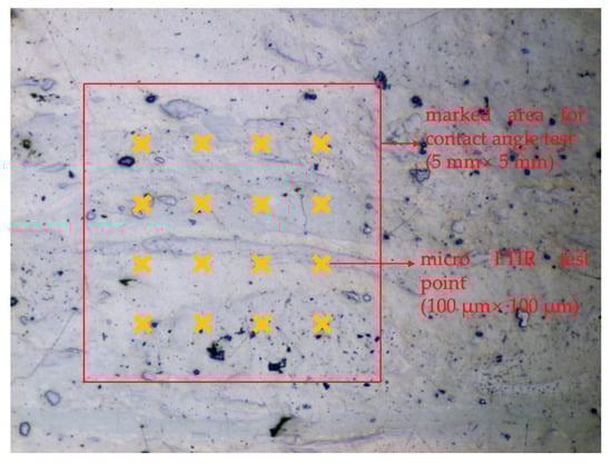 The micro-FTIR test was performed on the area where the contact angle was conducted and the block samples were dried each time before the tests. The experimental pattern of Liu et al. [23] and Wang et al. [24] was followed. As illustrated in Figure 1, the bubble was attached on the 5 mm × 5 mm square area for the contact angle test and the micro-FTIR tests were conducted on the 16 points evenly distributed within the same area. The size of testing points for micro-FTIR was 100 μm × 100 μm.