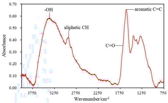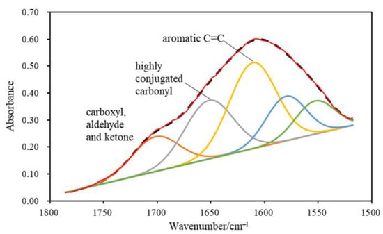 A typical FTIR spectrum of a series of testing points is presented in Figure 2. The absorbance of hydroxyl groups was intense due to the high content of oxygen-containing functional groups existing in high volatile coal samples. On the contrary, the aromatic CH stretching and out-of-plane deformation signals were not significant owing to the low metamorphic level of the coal sample. The absorbance peak band at 1500 cm−1–1800 cm−1 was resolved by the OMNIC software in order to obtain the relative content of functional groups such as carbonyl and aromatic C=C (Figure 3). In particular, carbonyl groups were resolved into different types: the carbonyl absorbance peak at ~1700 cm−1 (C=O_1700) showed the existence of carboxyl, aldehyde and ketone structures, while the peak at ~1650 cm−1 represented the highly conjugated carbonyl groups in the coal structure. The relative content of a certain functional group was calculated by the corresponding absorbance peak area.