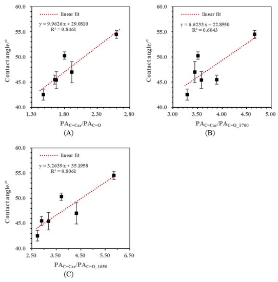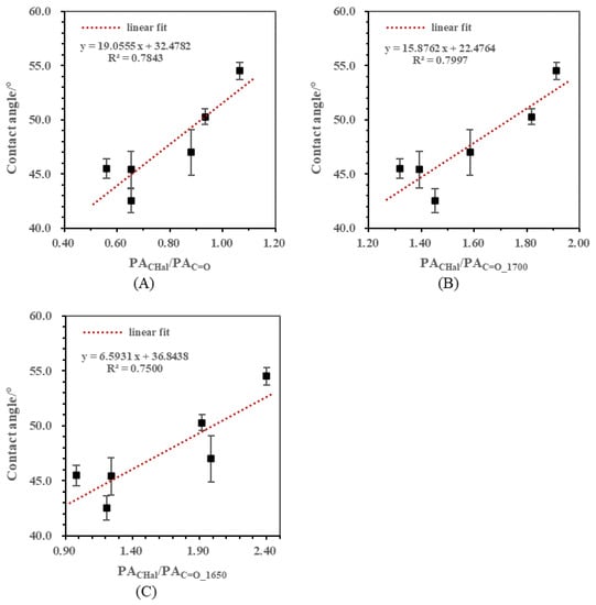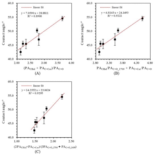 The correlation between the contact angle and (PACHal + PAC=Car)/PAC=O is shown in Figure 7A. In this ratio, aliphatic CH and aromatic C=C acted as the hydrophobic part and C=O served as the hydrophilic part. The determination coefficient R2 reached 0.8900 when CHal, C=Car and C=O were combined together.