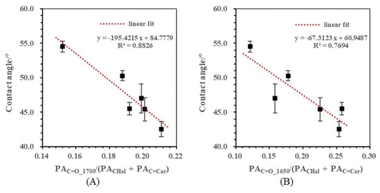 Correlations between contact angles and carbonyl semi-quantitative ratios. (A) Correlation between contact angle and PAC=O_1700/(PACHal + PAC=Car); (B) Correlation between contact angle and PAC=O_1650/(PACHal + PAC=Car).