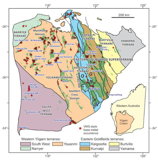 Major terrane and domain subdivisions of the Yilgarn Craton, Western Australia, showing the distribution of greenstone belts, and volcanogenic massive sulfide (VMS)-style base metal occurrences (red stars) after Hollis et al. [8]. Significant VMS deposits and prospective greenstone belts are labelled. Domains: B, Boorara; C, Coolgardie; G, Gindalbie; K, Kambalda; N, Norseman; O, Ora Banda. Abbreviations: GB, Greenstone belt; MB, Metamorphic belt.