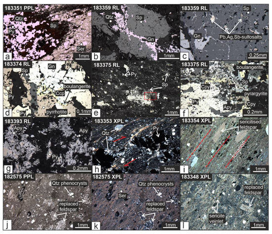 Photomicrographs of variably mineralized and hydrothermally altered dacite. (a) Sericitized dacite with early pyrite and quartz replaced by sphalerite. (b,c) Sphalerite brecciated by galena, which contains diverse inclusions of Pb,Ag,Sb-sulfosalts. (d–f) Minor interstitial pyrrhotite, chalcopyrite, boulangerite, and arsenopyrite to pyrite, sphalerite, and galena. (g) Arsenopyrite present as euhedral rhombs and overgrowths with tetrahedrite on earlier formed pyrite. (h) Sheared quartz±chlorite-carbonate-altered dacite containing euhedral pyrite. (i) Intensely sericitized dacite with altered feldspar laths orientated parallel to the main foliation. (j–l) Variably silica-sericite-altered dacite with randomly orientated feldspar phenocrysts. PPL, plane polarized light; RL, reflected light; XPL, cross polarized light.