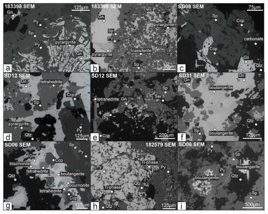 Backscatter SEM images of sulfide assemblages in mineralized dacite. (a,b) Early euhedral pyrite overgrown by sphalerite, which is replaced by an intergrowth of galena-pyrargyrite. Minor amounts of late cassiterite replace all earlier phases in Figure 7b. (c) Sphalerite intergrown with chalcopyrite in a quartz-carbonate gangue. Galena occurs as a replacive and fracture-filling phase in sphalerite-chalcopyrite. (d,e) Early formed pyrite overgrown by minor chalcopyrite. Subsequent sphalerite and tetrahedrite mineralization is replaced by galena. (f) Galena-boulangerite intergrowths replace early formed sphalerite. (g) Sphalerite is replaced by main ore stage pyrite. Chalcopyrite and tetrahedrite are replaced by galena (which is intergrown with boulangerite and bournonite). (h) Abundant fine diagenetic pyrite (right) and coarse hydrothermal pyrite (left) within silicified dacite. A widespread, but unknown, Ti-bearing phase occurs interstitially to masses of coarse pyrite. (i) Early formed coarse pyrite overgrown by sphalerite. Pyrite is replaced by boulangerite in the center of the image. To the right, boulangerite occurs interstitially and within quartz.