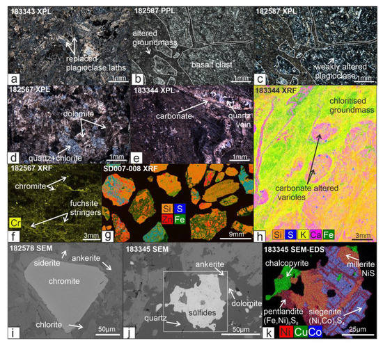 Photomicrographs, µXRF maps, and SEM images of hydrothermally altered and mineralized mafic rocks from the Nimbus deposit. (a) Carbonate-altered coherent basalt with replaced plagioclase laths. (b,c) Hyaloclastite breccia with well-preserved igneous textures in clasts and an altered groundmass. (d) Dolomite-quartz-chlorite-altered coherent basalt. (e) Intensely altered and quartz-carbonate veined basalt. (f) Cr abundance in coherent basalt highlighting stringers of fuchsite (Cr-mica) and small chromite grains. (g) µXRF maps of mineralized rock chips from the Au150 basalt (Figure 3a). (h) µXRF map of carbonate varioles in a coherent mafic sill. (i) SEM image of disseminated chromite grains surrounded by chlorite and carbonate. (j,k) SEM images of millerite replacing early formed siegenite and pentlandite, which is overgrown by chalcopyrite.