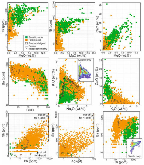- Jenner, G.A. Trace Element Geochemistry of Igneous Rocks: Geochemical Nomenclature and Analytical Geochemistry. In Trace Element Geochemistry of Volcanic Rocks: Applications for Massive Sulfide Exploration Short Course Notes 12; Wyman, D.A., Ed.; Geological Association of Canada: St. John’s, NL, Canada, 1996; pp. 51–77. [Google Scholar]