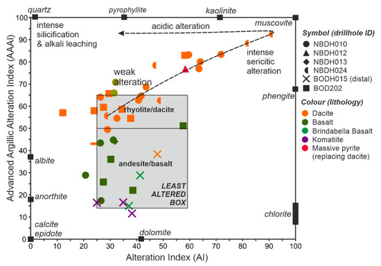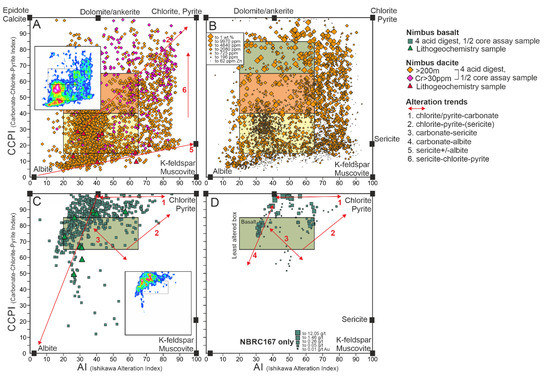 Box Plot diagrams after Large et al. [41] showing common major element geochemical trends associated with VMS mineralization at Nimbus for dacitic (A,B) and basaltic (C,D) rocks. The Box Plot uses two indices of alteration—the Alteration Index (AI) and Chlorite-Carbonate-Pyrite Index. Common alteration trends are shown and mineral nodes.