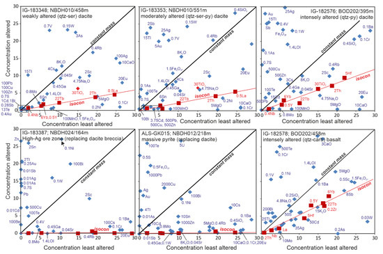 Isocon diagrams for representative samples from the Nimbus deposit (method after [42,43]). Isocons were fitted using a range of immobile elements, shown in red. Element concentrations are scaled for plotting convenience and to improve the clarity of the figure. If the element has been added to the rock, it will plot above the isocon (red line), and if it has been lost, it will plot below the isocon. Calculated mass change values are given in Supplementary Tables S2 and S3.