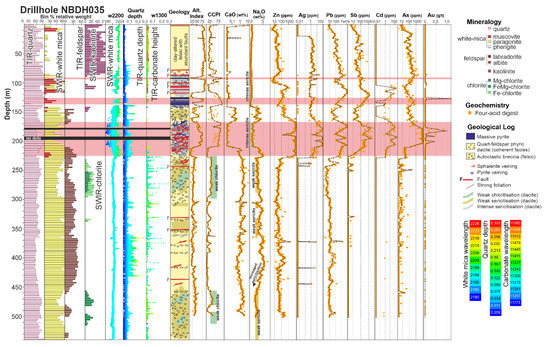 Hyperspectral and geochemical data for drillhole NBDH035 drilled under the Discovery Pit. Drillhole NBDH035 intersected massive polymetallic Zn-Ag-Pb ore and units of massive pyrite. The gangue mineralogy is dominated by quartz, white mica, feldspar, chlorite, carbonate, and kaolinite (near surface). Massive Zn-Ag-Pb sulfide mineralization is associated with elevated concentrations of Sb, Cd, As, and Au, depletions in CaO and Na2O, and zones of intense sericitization. The latter is marked by a complete loss of feldspar in the TIR signal, and the most paragonitic white mica compositions. Chlorite (both FeMg and Mg-rich) is restricted to key intervals associated with zones of weak sericitization. Carbonate abundance is sporadic throughout the hole. SWIR, short-wave infrared; TIR, thermal infrared.