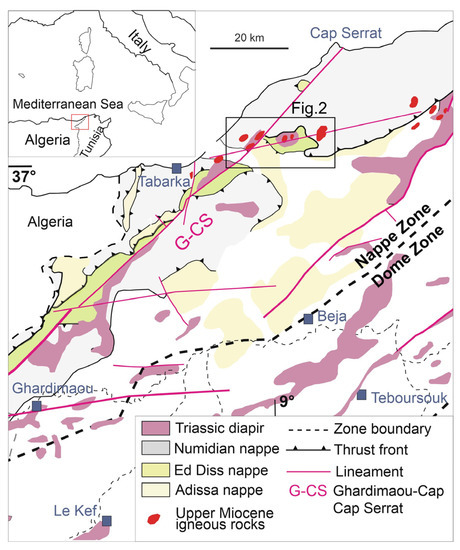 The entire nappe pile that forms a large part of the regional substratum is cut by shallow-level, Serravallian to lower Tortonian intrusive rocks. The felsic rocks of the whole district are dated between 12.9 ± 0.2 Ma and 8.2 ± 0.4 Ma (see a detailed review in reference [14]). In the Zouara basin (Figure 2), the transitional basalt sills exposed at Mokta el-Hadid have been dated at 8.4 ± 0.4 Ma [30], and at 6.9 ± 0.3 and 6.4 ± 0.2 Ma [17]. Some of these ages are discussed/questioned by Decrée et al., 2016 [14]. Anyway, the widespread middle-late Miocene bimodal magmatism is largely recognized at the scale of the whole district.