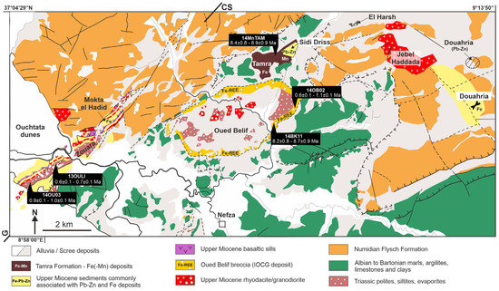 The Nefza-Sejnane mining district is located in the Tellian “Nappe Zone” of Northern Tunisia (Figure 1 and Figure 2). The district is characterized by the occurrence of late Cenozoic mineral deposits, overlying a substratum comprising folded marls Albian to late Priabonian in age, and Chattian–Burdigalian Numidian Flysch Formation [15], which are present as thrust sheets in the Tellian “Nappe Zone” [16]. The regional felsic sub-volcanic rocks were emplaced between 12.9 ± 0.5 Ma and 8.2 ± 0.4 Ma (Serravallian to Tortonian; e.g., [8]), while basaltic flows of the Zouara basin (Figure 2) were dated between 8.4 ± 0.4 Ma and 6.4 ± 0.2 Ma [17]. The Ghardimaou-Cap Serrat (G-CS) sinistral fault zone, a major regional structure guiding Alpine tectonics at the tectonic plate scale, and the regional N80°E lineaments controlled the magmatism and subsequent mineralization (Figure 1 and Figure 2; [14]). The first notable mineralization event in the area was associated with a major brecciation episode that led to the formation of the ring-shaped Oued Belif LREE-U hematite breccia [5]. The origin of this breccia is most likely related to the mixing of magmatic-hydrothermal fluids and basinal (evaporite) brines. A K-Fe alteration event, slightly predating the main mineralization, is dated at 9.2 ± 0.3 Ma using K-Ar method on K-feldspars [5]. The main Fe-LREE-U mineralization is coeval with a major episode of brecciation, most likely associated with the emplacement of the Oued Belif rhyolite intrusion. The remaining voids are filled with goethite, which, in some areas, is mixed with kaolinite and Ba-Mn oxide. The two SEDEX deposits (Sidi Driss and Douahria; Figure 2) are formed through thermally-driven fluid circulations related to magmatism and reactivation of shear zones during late Miocene extension in small basins (Decrée et al., 2016 [14]). The Pb-Zn ore of Sidi Driss is correlated with the stratified Fe-ore of Douahria, which yielded a large mammalian assemblage, late Miocene in age (originally spelled Douaria; e.g., [18,19,20]). The Tamra basin, unconformably overlying the Sidi Driss basin, is the host for iron mineralization in the form of a 50 m thick succession (Tamra Formation) of iron hydroxide-stained sediments together with kaolinite-halloysite lenses [1,3,4]. Previous datings on hollandite [Ba(Mn4+,Mn2+)8O16] and coronadite [Pb(Mn4+,Mn2+)8O16] from Tamra yielded Pliocene K-Mn ages [2]. The dated K-Mn oxides relate to mineralizing events closely connected with hydrothermal circulation and leaching of underlying mineralization of the Sidi Driss Pb–Zn SEDEX type deposit [2]. At Tamra, the δD and δ18O of halloysite-kaolinite are not in equilibrium with the potential Miocene-Pliocene meteoric fluids, confirming that they could be related to fluid-rock interactions with the underlying ores, marls, and/or skarns [4]. Late mineralization of galena, pyrite, and siderite in sub-vertical fractures cut the whole sequence of the district and are associated with a new hydrothermal event, still active in the area with numerous hot springs from 35 °C up to 70 °C and regional thermal gradients up to 100 °C/km [8]. Recent circulation of hydrothermal fluids is moreover confirmed by K-Ar dating of adularia at c. 0 Ma in the Oued Belif breccia [5].