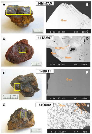 Samples of studied goethite and SEM microphotograph in back-scattered electrons mode, showing the pure character of supergene goethite of the samples 14MnTAM and 14BK11. Goe = goethite; Hem = hematite; Qz = quartz; Kfs = K-feldspar. (A) sample 14MnTAM, (B) SEM microphotograph in back-scattered electrons mode of sample 14MnTAM, (C) sample 14TAM07, (D) SEM microphotograph in back-scattered electrons mode of sample 14TAM07, (E) sample14BK11, (F) SEM microphotograph in back-scattered electrons mode of sample 14BK11, (G) sample 14OU02, (H) SEM microphotograph in back-scattered electrons mode of sample 14OU02.