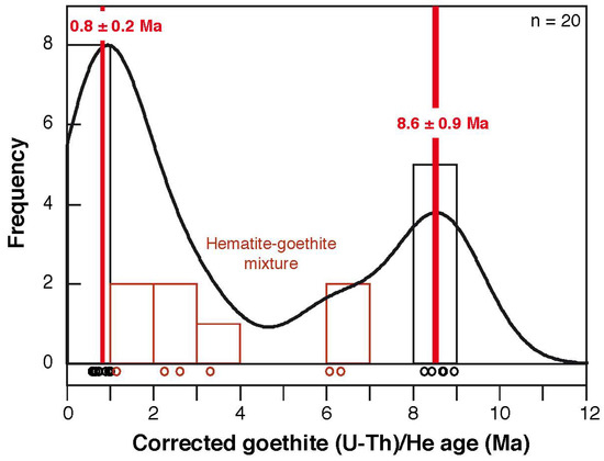 Corrected (U-Th)/He histogram age: supergene goethite in black histogram boxes and black circles (our data); hematite-goethite mixture in brown histogram boxes and brown circles (our data). The two main crystallization phases of supergene goethite at 8.6 ± 0.9 Ma and 0.8 ± 0.2 Ma are also reported in red. For hematite-goethite mixed samples, (U-Th)/He ages range between the two main weathering phases.