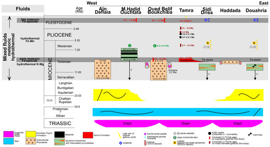 The stratified Fe ore of Douahria is stratigraphically correlated with the SEDEX-type Pb-Zn ore of Sidi Driss related to thermally-driven fluid circulations [1]. From biostratigraphic and biogeographic perspectives, the Douahria gastropod assemblage has a late Neogene signature at a Maghreb scale (late Miocene–Pliocene; [31,32]), without further precision. Only a late Miocene age of these fossils is in agreement with our (U-Th)/He dating of the Fe-rich fluids (ferruginous crust) of the area, suggesting that the first episode of ferruginous crust containing the fossils is late Tortonian in age (8.6 ± 0.9 Ma—see above).
