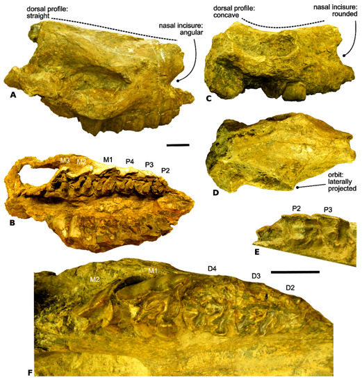 Selected rhinocerotid remains from the early Tortonian Douahria fossil locality, Tunisia. (A,B), Ceratotherium douariense [19], adult skull FSL 16749 (holotype). (A), right lateral view; (B), palatine view, with left and right dental series (premolars (P2–P4) and molars (M1–M3)). (C–F), Unidentified elasmotheriine, juvenile skull FSL 16752 (formerly paratype of C. douariense). (C), right lateral view; (D), dorsal view; (E), detailed occlusal view of the left dental series, with emerging 2nd and 3rd premolars (P2–P3); (F), detailed occlusal view of the right dental series, with decidual teeth (D2–D4) and functional 1st and 2nd permanent molars (M1–M2). Scale bars = 5 cm.