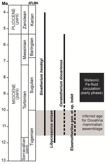 Biochronological chart of late Neogene times, detailing the inferred ages of both the Douahria mammalian assemblage and first phase of meteoric fluid circulation. Biochronological data from [19,20,60,61]. AFLMA = African Land Mammal Ages [72].