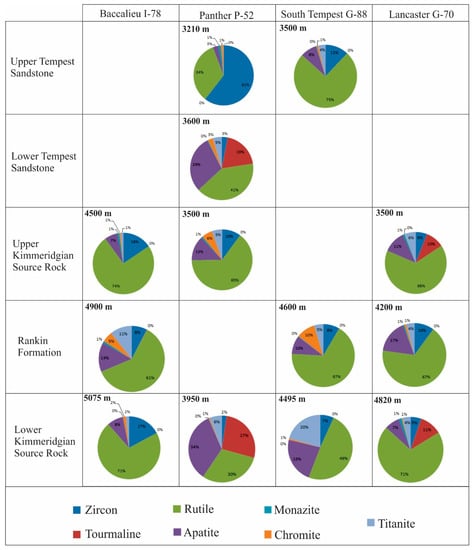 Heavy mineral counts were obtained from 20 cuttings samples from intervals of the Upper and Lower Kimmeridgian Source Rock, the Upper and Lower Tempest Sandstone and the interbedded Rankin Formation. Pie charts of the proportions of heavy minerals in a series of 13 representative samples are shown below in Figure 4. Of the 13 samples shown, seven are dominated by rutile (61–75% of the total heavy mineral count), zircon (8–17%) and apatite (7–17%), and three of the seven also contain significant amounts of chromite (5–10%). This heavy mineral assemblage is the most widespread among the samples, comprising the G-88 well in the Upper Tempest Sandstone, the I-78 and P-52 wells in the Upper Kimmeridgian Source Rock, the I-78, G-88 and G-70 wells in the Rankin Formation and the I-78 well in the Lower Kimmeridgian Source Rock. Thus, this heavy mineral assemblage is present in all of the units examined in this study except the Lower Tempest Sandstone.