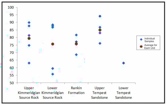 Two plots are show below with the ZTR values for 20 samples from the various formations (Figure 5). Substantial heterogeneity is present for the Upper and Lower Kimmeridgian Source Rock units, while the Upper Tempest Sandstone and Rankin Formation samples are more homogeneous. Having only a single sample from the Lower Tempest Sandstone limits the significance of an interpretation of this interval. Overall, looking at the average values, it appears that most of the formations possess a similar average ZTR value in the range of 70–80. However, the average ZTR of the Upper Tempest Sandstone is slightly higher, at 85.