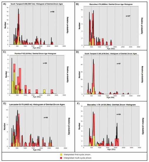 Detrital zircon age histograms (bars) and probability density plots (curves) for samples from four wells. The number of analyses shown includes only those that are concordant within 10%. Bin widths vary based on number of grains analyzed per sample. (A) Upper Kimmeridgian Scheme 88. (3837.3 m). (B) Upper Kimmeridgian Source Rock Mudstone cuttings sample from Baccalieu I-78 (4500 m). (C) Upper Tempest Sandstone cuttings sample from Panther P-52 (3210 m). (D) Lower Tempest Sandstone core sample from South Tempest G-88 (4195.8 m). (E) Rankin Formation Mudstone cuttings sample from Lancaster G-70 (4405 m). (F) Rankin Formation Sandstone core sample from Baccalieu I-78 (4135.29 m). First or multi-cycle zircon grains identified on the basis of grain morphology.