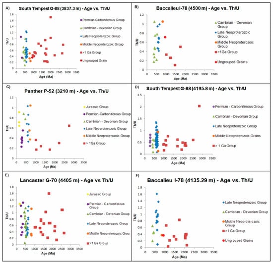Age vs. Th/U graphs for samples from four wells. (A) Upper Kimmeridgian Source Rock Sandstone core sample from South Tempest G-88 (3837.3 m). (B) Upper Kimmeridgian Source Rock Mudstone cuttings sample from Baccalieu I-78 (4500 m). (C) Upper Tempest Sandstone cuttings sample from Panther P-52 (3210 m). (D) Lower Tempest Sandstone core sample from South Tempest G-88 (4195.8 m). (E) Rankin Formation Mudstone cuttings sample from Lancaster G-70 (4405 m). (F) Rankin Formation Sandstone core sample from Baccalieu I-78 (4135.29 m).