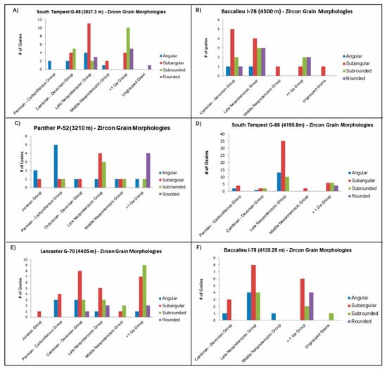 Histograms of zircon grain morphology for samples from four wells. (A) Upper Kimmeridgian Source Rock Sandstone core sample from South Tempest G-88 (3837.3 m). (B) Upper Kimmeridgian Source Rock Mudstone cuttings sample from Baccalieu I-78 (4500 m). (C) Upper Tempest Sandstone cuttings sample from Panther P-52 (3210 m). (D) Lower Tempest Sandstone core sample from South Tempest G-88 (4195.8 m). (E) Rankin Formation Mudstone cuttings sample from Lancaster G-70 (4405 m). (F) Rankin Formation Sandstone core sample from Baccalieu I-78 (4135.29 m).
