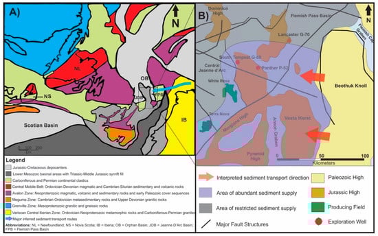 Mesozoic rocks of offshore Newfoundland are restricted to a series of northeast-trending rift basins. These basins are typically half-graben structures separated by Precambrian and Paleozoic basement highs and include the Jeanne d’Arc, Flemish Pass, East Orphan, and West Orphan basins (Figure 1). These Mesozoic basins were formed by rifting associated with the break-up of Pangea, spanning from the Permo-Triassic to the mid-Cretaceous [11,13,14]. Rifting progressed from south to north during the Late Triassic to the Early Cretaceous, which provided the conditions necessary for basin formation on the continental margin of Newfoundland. From the mid-Cretaceous to the present day, the evolution of the basins has been controlled by North Atlantic seafloor spreading and passive margin sedimentation [11,13,14]. Of these basins, the Jeanne d’Arc Basin is the most prolific hydrocarbon province, with four producing fields.