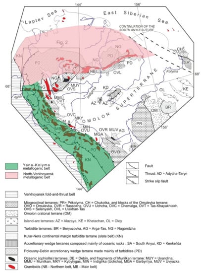 Figure 1. Tectonic map of the north-eastern Verkhoyansk–Kolyma orogenic belt, modified from [1,2].
