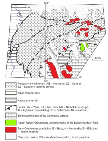 58. Layer, P.W.; Newberry, R.; Fujita, K.; Parfenov, L.M.; Trunilina, V.A.; Bakharev, A.G. Tectonic setting of the plutonic belts of Yakutia, Northeast Russia, based on 40Ar/39Ar and trace element geochemistry. Geology 2001, 29, 167–170. [Google Scholar] [CrossRef]