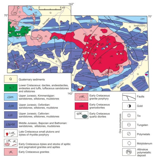 63. Nenashev, N.I.; Zaitsev, A.I. Evolution of Mesozoic Granitoid Magmatism of the Yana-Kolyma Fold Area; YaF SO AN SSSR: Yakutsk, Russia, 1985. (In Russian) [Google Scholar]