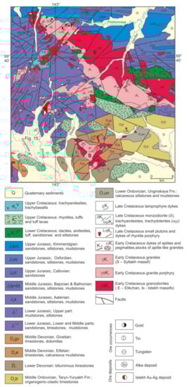 Figure 3. Geological map of the Kuranakh ore field, modified from [60].