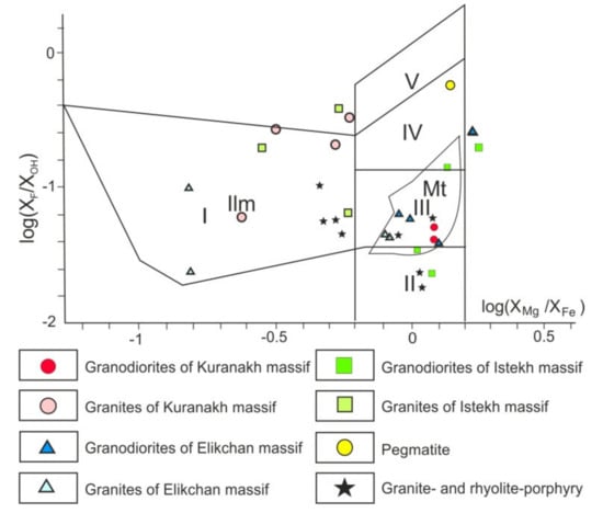 Figure 5. F/OH–Mg/Fe diagram for biotites of mаgmatic rocks. Fields of biotite derived from melts [69]: I—contaminated and assimilated marine metasediments; II—mantle; III—crust-mantle, IV—mantle-crustal, and V—crustal anatectic.
