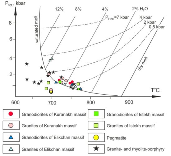 Plagioclase forms idiomorphic tabular crystals, either unzoned or directly zoned, with an intensely sericitized central part, and its composition varies from 26–32% An in phenocrysts to 12–16% An in small grains and porphyry groundmass. K-feldspar comprises medium- to low-ordered cryptoperthitic microcline (2VNp = 62–80°) and is typically highly albitized, but is less idiomorphic when intergrown with plagioclase. Quartz is irregular in form and occurs as intergrowths with K-feldspar. Biotite is represented by early-generation eastonite–annite, forming intergrowths with oligoclase, and by late-generation highly ferruginous siderophyllite (f = 77–87%), forming fine grains that accumulate in the interstices of salic minerals. Both generations of biotite are replaced by chlorite and muscovite. The water content of the melt ranged from 3.5 wt. % during early-generation crystallization to 8 wt. % during late-generation crystallization (see Figure 6). The pressure and temperature of biotite crystallization were obtained after [44,45,46,47,48] (see Table S2). Our estimates of these parameters [70] suggest that biotite crystallized under reducing conditions at moderate or low chlorine- and low fluorine-bearing fugacities. Water- and fluorine-bearing fugacities were only high during the crystallization of late-generation biotite in the granites of the Istekh massif. The water pressure did not exceed the load pressure (Ptot) (Figure 6). The biotite contains abundant monazite, ilmenite, and apatite inclusions.