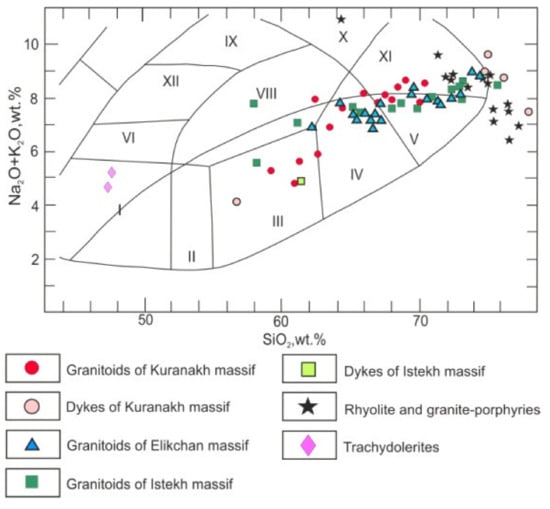 Figure 7. SiO2–(Na2O + K2O) diagram for mаgmatic rocks. Fields on the diagram [77]: I—gabbro; II—gabbro–diorite; III—diorite, IV—granodiorite, V—granite; VI—subalkaline gabbro; VII–VIII—monzonite; IX–X—syenite; and XI—alkali granite.