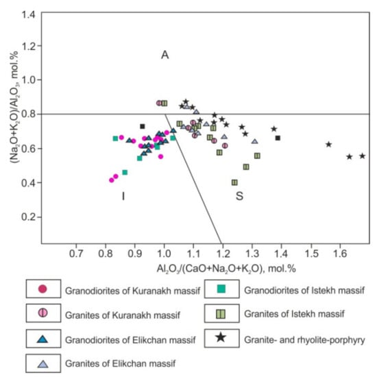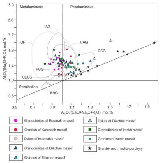 Figure 8. Al2O3/(Na2O + K2O)–Al2O3/(CaO + Na2O + K2O) diagram for granitoids [78]. Granitoid fields include: IAG—island arcs; CAG—continental arcs; CCG—continental collision settings; POG—postorogenic; CEUG—continental epirogenic uplifts; and RRG—rift-related.