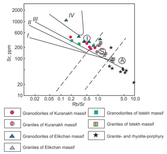 Figure 9. Sr–Rb/Sr diagram for granitoids. Differentiation trends of type series include [79]: I—island-arc tholeiitic; II—island-arc calcareous-alkaline; III—active margin calcareous-alkaline; IV—continental rift zones; and I, S, A—granitoid petrotypes.