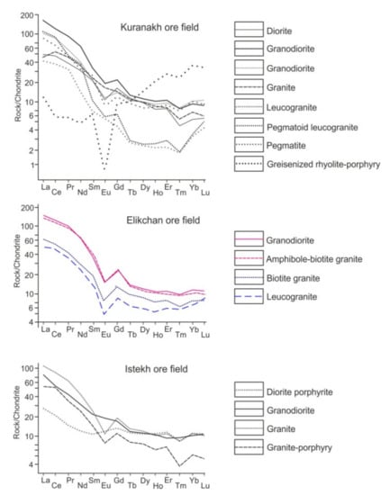 Figure 10. Chondrite-normalized [80] rare-earth element (REE) patterns of magmatic rocks within the Kuranakh, Elikchan, and Istekh ore fields.