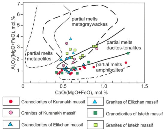 Figure 11. Al/(Mg + Fe) vs. Ca/(Mg + Fe) diagram for granitoids. Fields of magma-generating substrata are derived from [85].