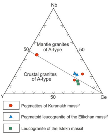 Based on their composition, pegmatoid leucogranites and pegmatites of the Kuranakh massif correspond to postorogenic A-type granites (see Figure 8 and Figure 9). The calculated magma generation conditions are similar to those for granites (P = 0.7–0.8 GPa, T = 919–935 °C), and the Y–Nb–Ce ratios correspond to a mantle or crustal–mantle protolith (Figure 12) [89].