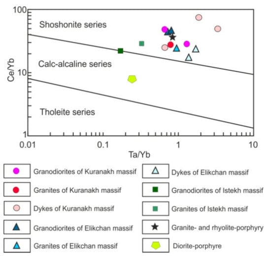 The trace element distribution in granitoids of the massifs and in dykes is highly irregular. However, all of the studied magmatic rocks, regardless of age and composition, exhibit a well-defined geochemical specialization for chalcophile elements (Sb, Bi, Ag, and As), W and B. These elements are characteristically derived from latitic magma (Table S5) [52]. High Ba and Sr contents, along with La/Yb values of 10–46, also indicate a latitic geochemical affinity [91,92]. On a Сe/Yb–Ta/Yb diagram [93], granitoid data plot in the shoshonite series field, although a single diorite porphyrite data point plots in the calc-alkaline series field (Figure 13).