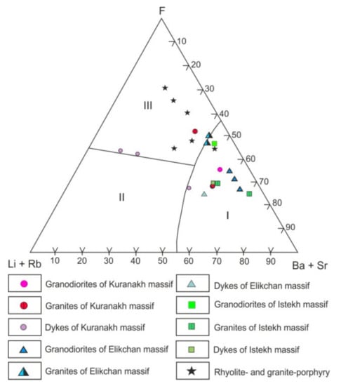 Figure 14. (Li + Rb)–F–(Ba + Sr) diagram for granitoids. Fields on the diagram are derived from [94]: I—barren; II—weakly mineralized; and III—highly mineralized granitoids.
