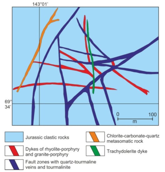 Trachydolerite dykes are latitic in terms of their trace element content and distribution. They are enriched in the same elements as the granitoids of the massifs and the dyke rocks (Table S5). Tourmalinization and Sn–W mineralization are not superimposed on the trachydolerites. In the Istekh ore field, greisenized rhyolite porphyry dykes are cut by fault zones, hosting tourmaline–quartz veins containing 0.1–1.5 wt. % Sn, 0.5 wt. % W, and 0.1–1.0 g/t of Au. These faults and veins are cross-cut by a trachydolerite dyke (Figure 15). Thus, the age of the Sn, W, and Au mineralization here is post-granitic and post-rhyolitic, but pre-dates intrusion by trachydolerite dykes. The younger quartz–carbonate–chlorite and chlorite veins, which contain large fragments of greisenized granite porphyry, intrude the trachydolerites.