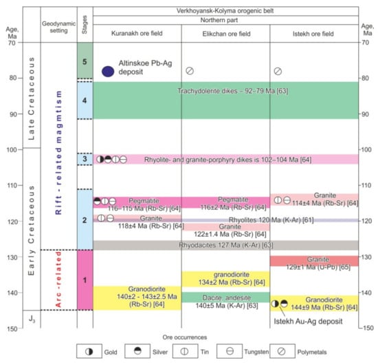 During the Berriasian–Barremian, granitoid emplacement was preceded by subaerial lava flows of varying compositions, with features characteristic of active continental margin volcanic rocks [62]. An association of mainly felsic volcanic rocks and granitoids formed during the Aptian. The K–Ar isotopic age of the andesites is 140 ± 5 Ma, of the rhyodacites it is 127 ± 2 Ma, and of the rhyolites it is 120 ± 3 Ma [63]. In the Kuranakh massif, the Rb–Sr isotopic age of the granodiorites is 140 ± 2 Ma, of the amphibole–biotite granites it is 143 ± 3 Ma, of the biotite granites it is 118 ± 4 Ma, and of the pegmatites it is 116–115 Ma. In the Elikchan massif, the Rb–Sr isochron age of the granodiorites is 134 ± 2 Ma, of the biotite granites it is 122 ± 2 Ma, and of the pegmatites it is 116 ± 2 Ma. In the Istekh massif, the Rb–Sr isochron age of the granodiorites is 144 ± 9 Ma and of the biotite granites it is 114 ± 4 Ma [64]. The U–Pb (sensitive high-resolution ion microprobe) age of the granites is 129 ± 1 Ma [65]. Lava flows and dyke intrusions continued after the formation of granitoids until the Late Cretaceous. The Rb–Sr isotopic age of rhyolite- and granite-porphyry dykes is 104–102 Ma and that of trachydolerite dykes is 92–79 Ma [64]. Thus, within the studied ore fields, magmatic rocks range in age from Berriasian to Campanian.